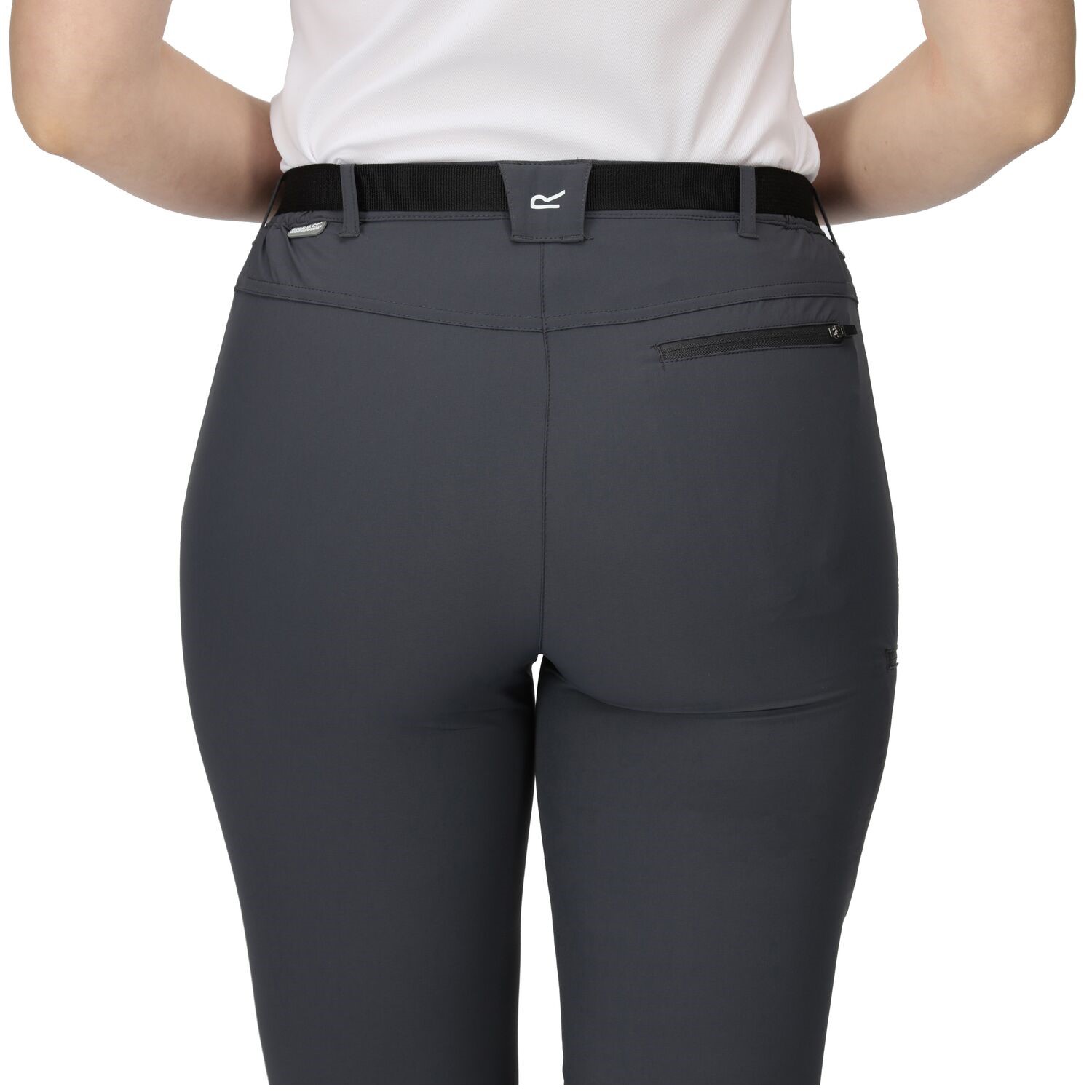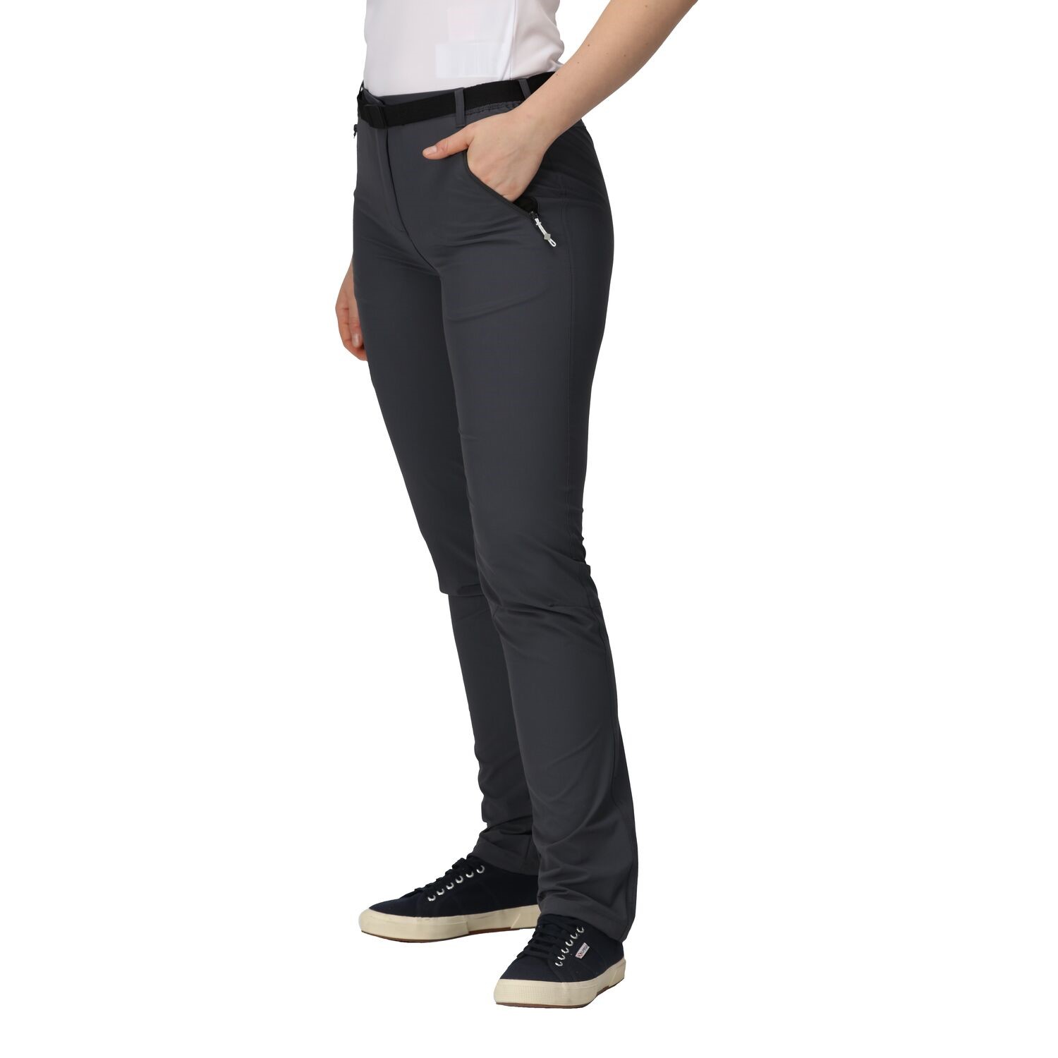 Die Regatta Damen Outdoorhose aus 4-Wege-Stretch Material ,mit Wasser und Schmutzabweisendem ,Gewebe für dein Outdoor Abenteuer. ,Ein teilelastischer Bund mit Gürtelschlaufen inkl. Gürtel ,. Robuster Stoff mit Wasserabweisender Oberfläche schützen dich bei einem kleinen Schauer und gibt die genug Bewegungsfreiheit. Offener Beinabschluss mit Weitenverstellung. ,