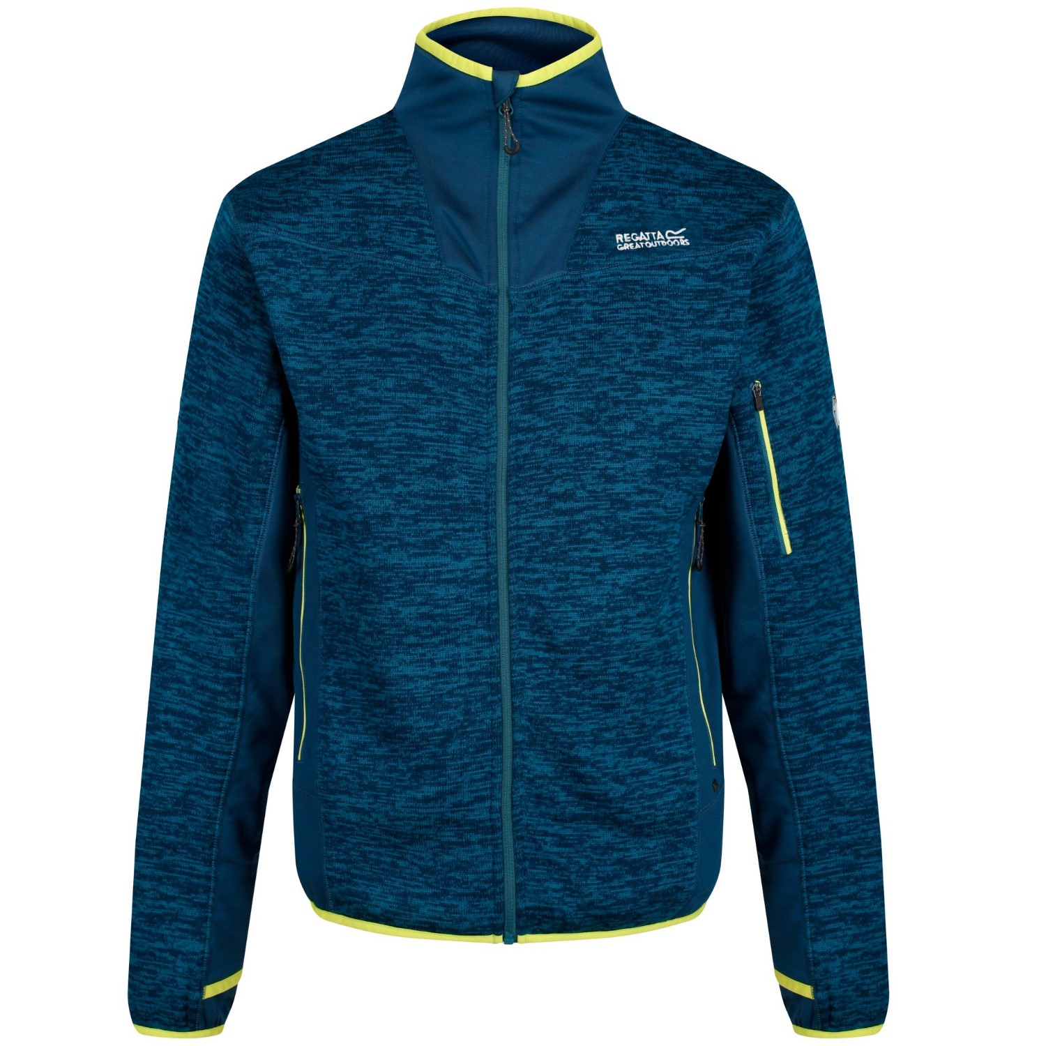 Modische Strickfleecejacke Collumbus V von Regatta für kühle Tage zu jeder Jahreszeit.Außen eine schöne Strickoptik mit verschließbaren Taschen ,und innen Fleece. Durchgehender Reißverschluss mit Einklemmschutz an Kragen. Hoher Kragen, elastischer Saum und Armabschlüsse sowie zwei verschließbare Taschen plus eine am linken Oberarm. ,